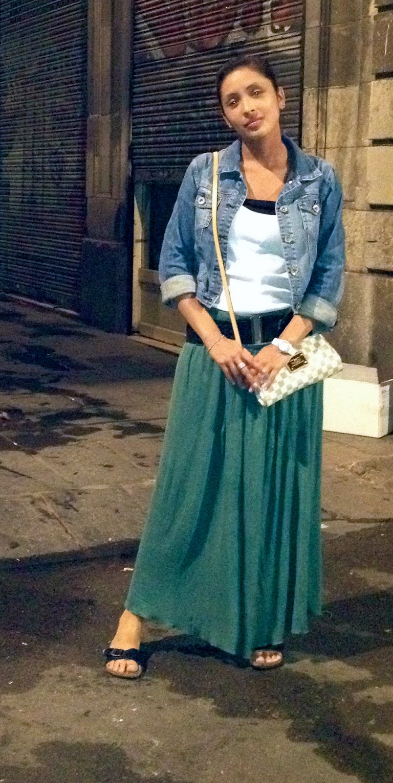 Outfit ideale per una serata d’estate in giro per la città, ottimo per quando esci di casa senza sapere dove andrai e cosa farai, ma neppure a che ora tornerai a casa. Gonna larga e lunga di cotone grezzo di color verde firmata United Colors of Benetton, canottiera a costine bianca di Intimissimi con sotto raggiseno a fascia. Giacca di jeans con maniche arrotolate. Cintura alta nera di Goodwin e pochette con tracolla damier chiaro Louis Vuitton. Sandali Madrid Birckenstock.